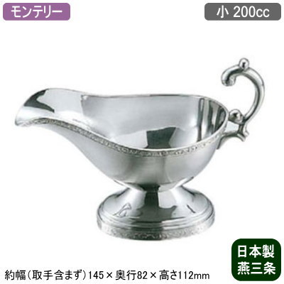 ◆【日本製/燕三条製】 18-8ステンレス製のモンテリーソースポットです。 ◆持ち手はオシャレなデザイン。渕はゴージャスな模様が入っています。 ◆使った後も洗いやすく、ホテルやレストランで広く使われています。 ◆適度な重量感が、テーブルに落着いた雰囲気を醸し出します。 ◆カレーやシチュー、ローストビーフのソースやサラダのドレッシング など使い方いろいろ! ◆食卓にひとつ置いて、取り分け用としてもお使いいただけます。 ◆業務用はもちろん、ご家庭でもお使いいただければ高級レストラン の雰囲気を満喫できます。 他のソースポットはこちら 【商品仕様】 ●サイズ/約幅(取手含まず)145×奥行82×高さ112mm ●容量/約200cc ●材質/18-8ステンレス ●日本製(新潟県燕三条) ※メーカーに在庫がある場合は3営業日以内に発送させて いただきますが、稀に在庫がない場合もございますので、 お急ぎの場合はお問い合わせください。