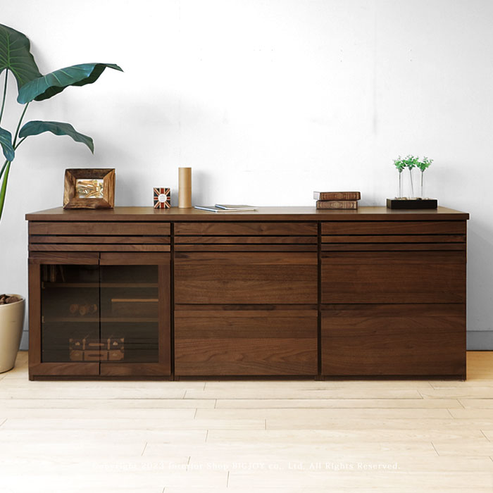 リビングボード 180 Cタイプ ウォールナット ウォールナット材を使用したユニット型のモダンスタイルの収納ボード(幅180cm)。Cタイプはガラス扉と引出の組み合わせになります。 天板には重厚な木目と上品な色合いが魅力のウォールナット突板を使用しており、シックで高級感のあるお部屋作りに一役買います。 配線孔が天板に付いているのでコード類もスマートに配線でき、スタンドライトや電話などのコード配線に便利です。 向かって右側の3段引き出しはすべてスライドレールを採用しており使い易さを追及。ユニットは左右組み換えが可能です。 素材はウォールナットとホワイトオークの2色からオーダー可能です。 収納引き出し 3段の引き出しには整理整頓に便利な仕切り板が付属します。衣類や小物等の収納に便利です。 スライドレール付き引き出し 全ての引き出しにスライドレールを採用しています(2杯以上引き出すと転倒する恐れがありますので1杯ずつ引き出してください)。 補強用サン入り 引き出しの底板裏には補強用のサンが入っているので、強度が高く末永くお使いいただくことが出来ます。 可動棚、耐震ダボ すべての棚板は可動棚を採用しているので仕舞う物の大きさに合わせて昇降調節可能。また散乱、飛び出しなどの危険を避避ける為、耐震ダボが付いています。 天板、サクリ加工 天板の後側には配線孔があるので家具と壁の間に隙間が空いてなくてもコードを通すことができます。 天板が1cm後ろに伸びています 本体に比べて天板が1cm後ろに伸びたことで巾木を避けることができ、壁に付けてボードを設置できます。 配線孔 キャビネットユニットの裏側には配線用のコードホールが設けてあります。 連結孔 それぞれのユニットの側板には連結用のボルト穴が設けてあり、連結しない箇所は付属のキャップで穴を塞げます。 バリエーション 好きなユニットと天板を自由に組み合わせて自分仕様の収納ボードが作れるユニット収納シリーズです。上の写真はホワイトオーク材の製品を使用しています。 関連商品 ガラス扉60 引き出し60 引き出しOP60 板扉60 デスク90A デスク90B デスク120A テレビボード210 テレビボード210 サイズ幅1800×奥行473×高さ700mm 素材ウォールナット材・ウォールナット突板・プリント化粧版 塗装セラウッド塗装(F☆☆☆☆) 備考【引出60】内寸(仕切り板有)/1段目:幅506×奥行365×高さ70mm/2段目:幅506×奥行365×高さ175mm/3段目:幅506×奥行365×高さ235mm 【ガラス扉60】内寸(可動棚2枚)/幅560×奥行420(棚奥行320)×高さ485mm(内部に蝶番があります) 天板取付/生産国:日本 送料北海道・沖縄県・一部地域・離島は別途料金がかかります 配送こちらの商品は開梱設置配達サービスでの配送となります。 ※天然木を使用しているため節や白太、赤身などでる場合がございます。また生産時期や環境により、木目や色目が掲載写真と異なる場合がございますが予めご了承ください。 同じシリーズの商品はコチラ